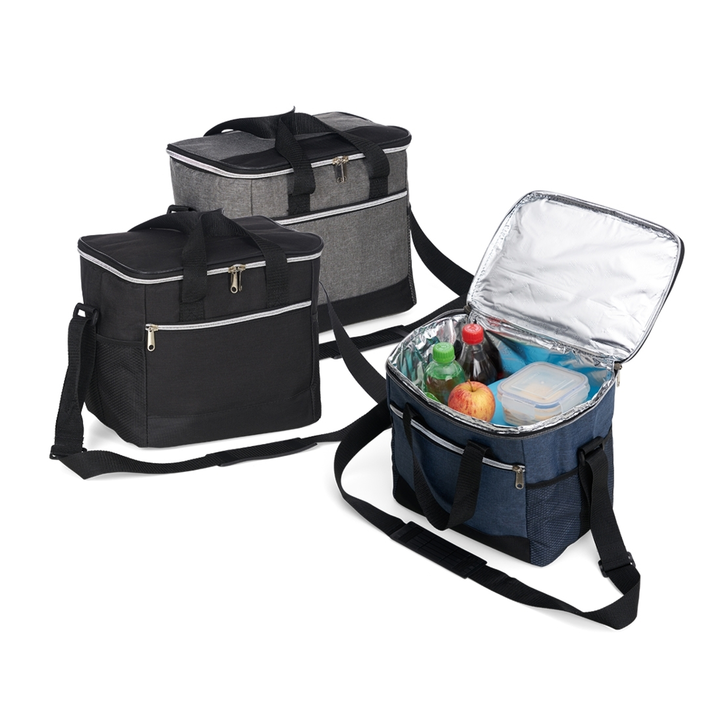 Bolsa térmica confeccionada em poliéster resistente à água e capacidade de até 15 litros. Possui revestimento interno em PEVA antivazamento, que ajuda a conservar a temperatura de alimentos e bebidas por mais tempo. Conta com bolso frontal com zíper, dois bolsos laterais em tela de nylon, alças de mão e alça transversal fixa, regulável e com apoio para ombro.